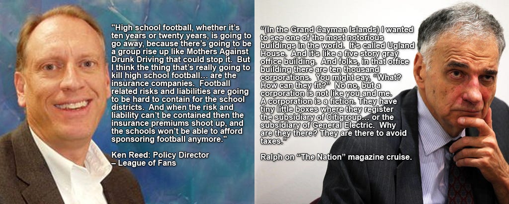 We talk concussions with policy director from League of Fans, Ken Reed. And our intrepid reporter, Ralph Nader, tells us about his week on “The Nation” magazine cruise, where instead of taking a Zumba class, he visited “Ugland House,” the building in the Grand Cayman Islands that corporations use to avoid U.S. taxes.