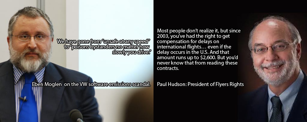 Ralph talks to Columbia Law Professor and software expert, Eben Moglen, about the recent VW scandal and how computer software in cars and voting machines is ripe for mischief and accidents. And Paul Hudson, president of Flyers Rights tells us how we can fight bad airline service.