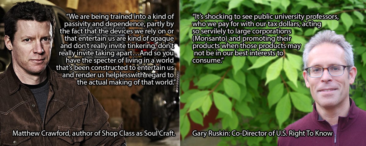 Author and car mechanic Matthew Crawford talks to us about his book Shop Class as Soul Craft: An Inquiry Into the Value of Work about what it means to be able to work with one’s hands. And co-founder of U.S. Right To Know, Gary Ruskin(gary@usrtk.org), tells what we can do to find out what is really in our food. And after the latest deferred prosecution, Ralph calls GM a “homicidal fugitive from justice.”