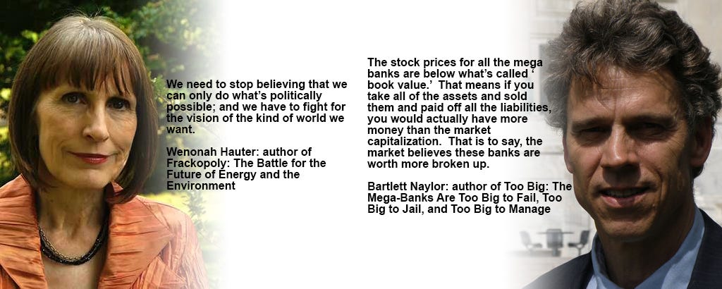 Ralph talks fracking with Wenonah Hauter author of Frackopoly, and then delves into finance with consumer financial expert, Bartlett Naylor, who contends that the mega-banks are not only too big to fail and too big to jail; they’re even too big to manage.